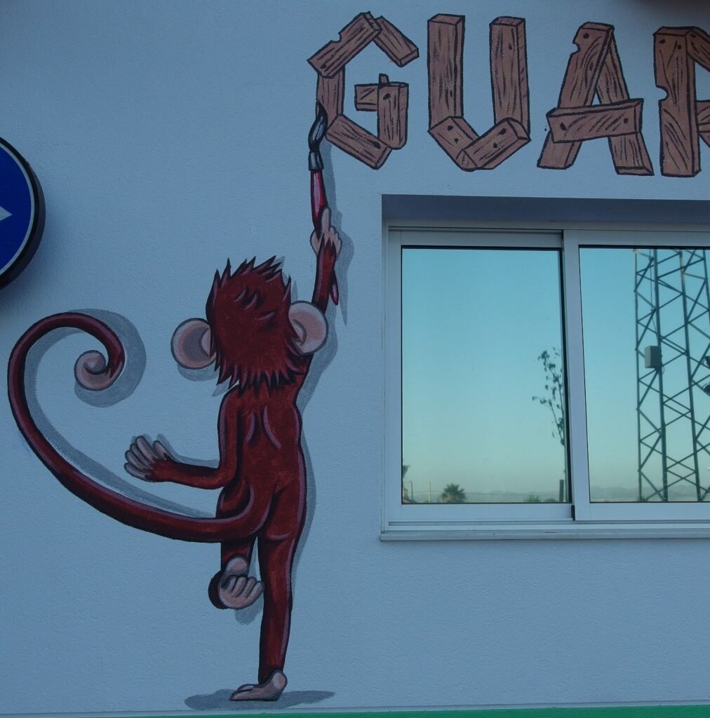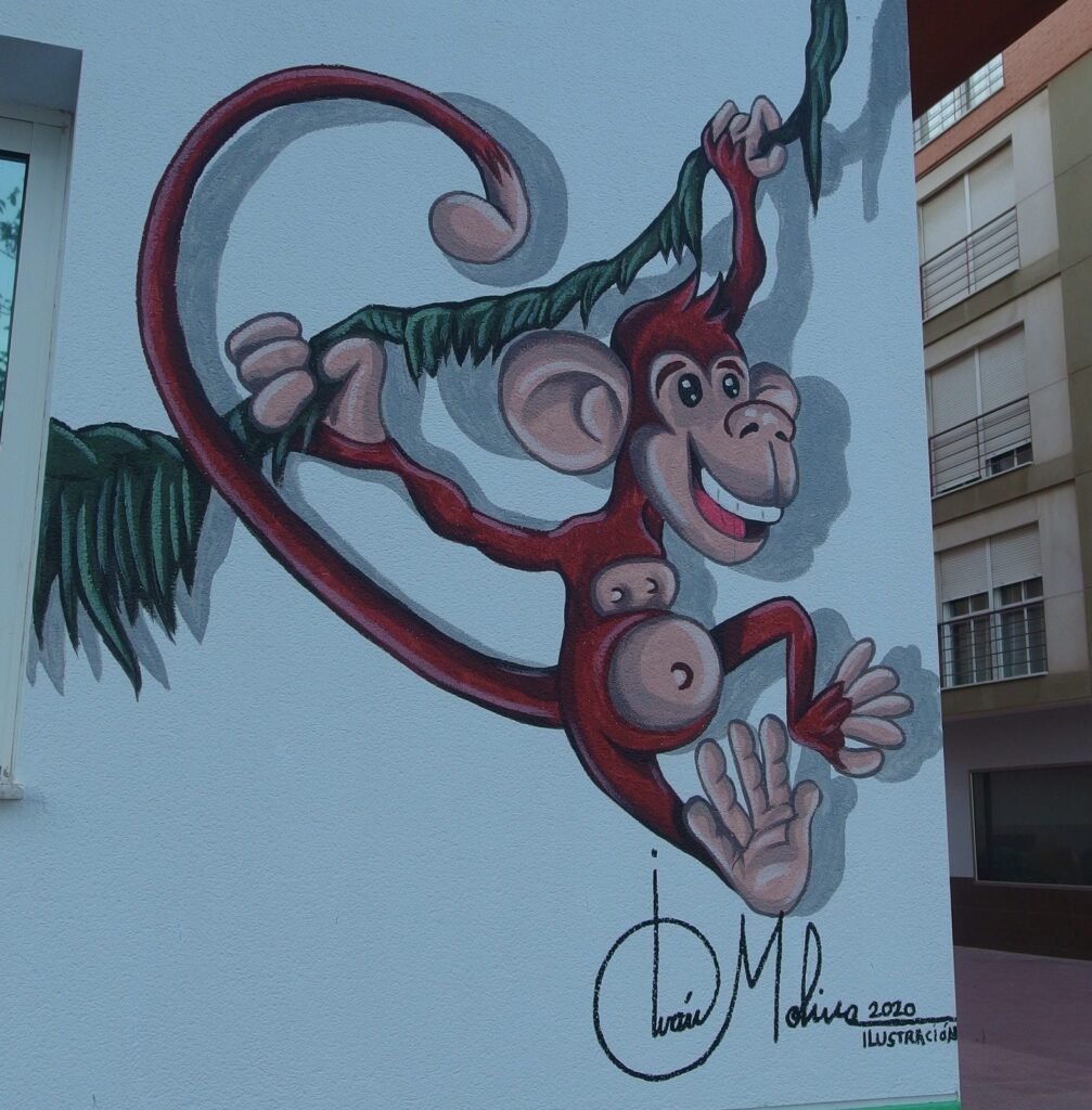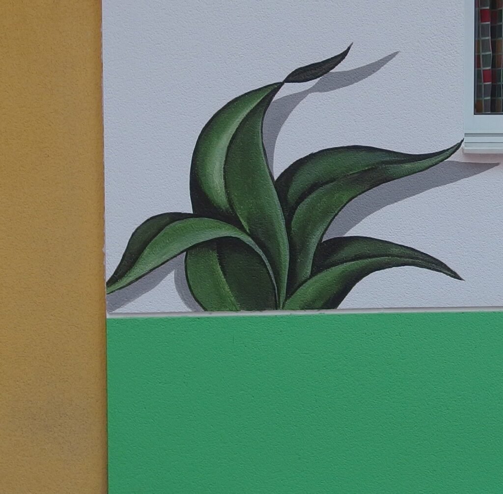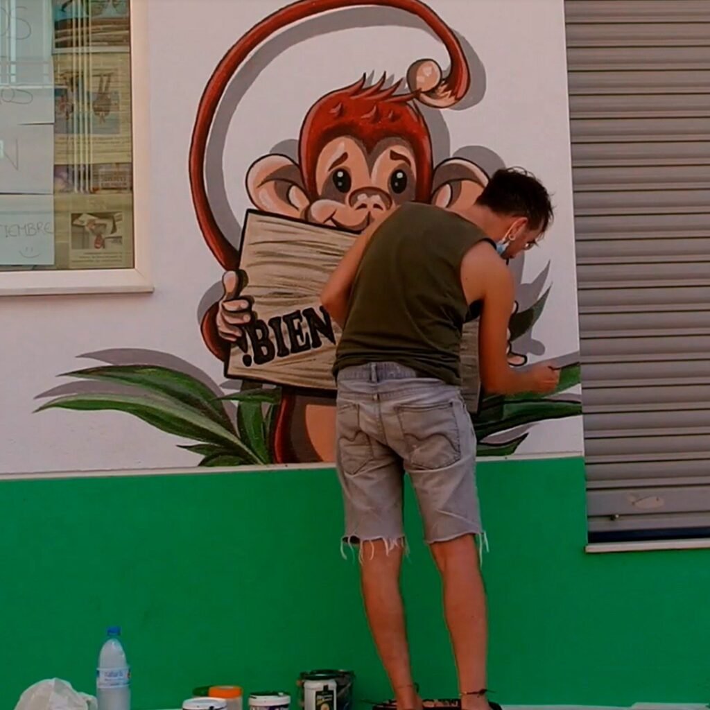 en Calle Dolores Blaya Cueto en Lorca, junto a la estación de San Diego. Mural decorativo a pincel sobre fachada. Pintura plástica elástica. Agosto 2020.